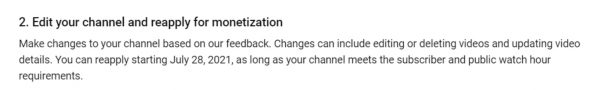 YouTube’s notice put it as follows: “Edit your channel and reapply for monetization… Make changes to your channel based on our feedback. Changes can include editing or deleting videos and updating video details.”