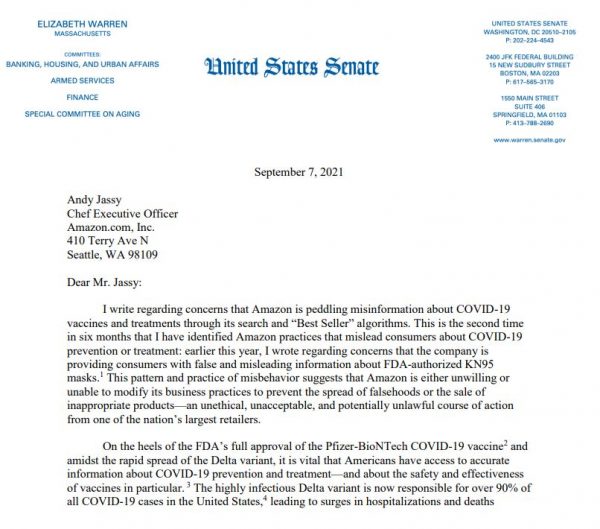 “During the week of August 22, 2021, my staff conducted sample searches on Amazon.com of pandemic-related terms such as ‘COVID-19,’ ‘COVID,’ ‘vaccine,’ ‘COVID 19 vaccine,’ and ‘pandemic,'” Sen. Warren wrote in a letter addressed to Amazon’s CEO Andy Jassy. “The top results consistently included highly-ranked and favorably-tagged books based on falsehoods about COVID-19 vaccines and cures.”