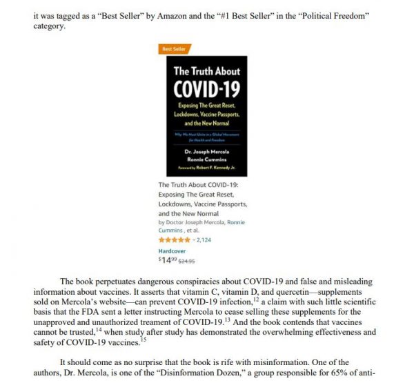 “[Dr. Mercola] has posted over 600 articles on Facebook casting doubt on COVID-19 vaccines and been subject to multiple federal investigations (with one false- advertising investigation leading to a $2.95 million consumer settlement). But Amazon’s algorithms promoted ‘The Truth About COVID-19’ as a best seller and top result in response to common pandemic-related search terms,” Warren wrote.