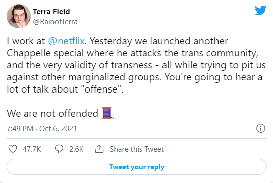 Following the release of The Closer, Terra Field, a trans Netflix senior software engineer who was one of the three initially suspended, posted a viral response last week in which she was critical of her employer.
